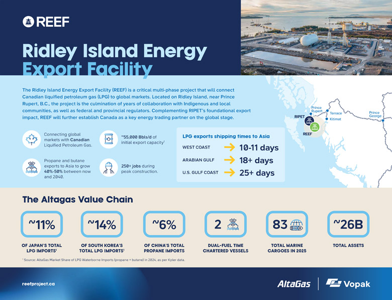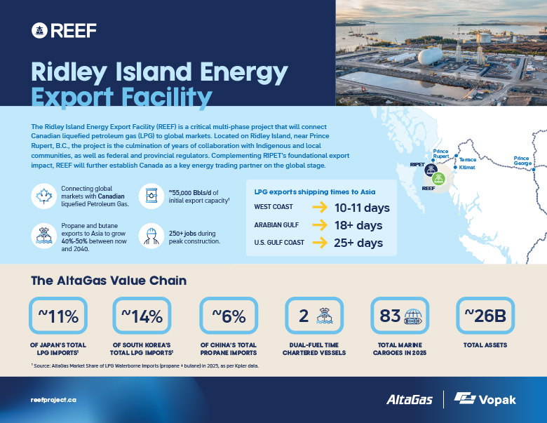 Welcome to the Ridley Island Energy Export Facility (REEF) project. REEF is a joint venture between AltaGas and Royal Vopak, and will be a critical project to connect Canadian liquified petroleum gas (LPG) – like propane and butane to global markets.